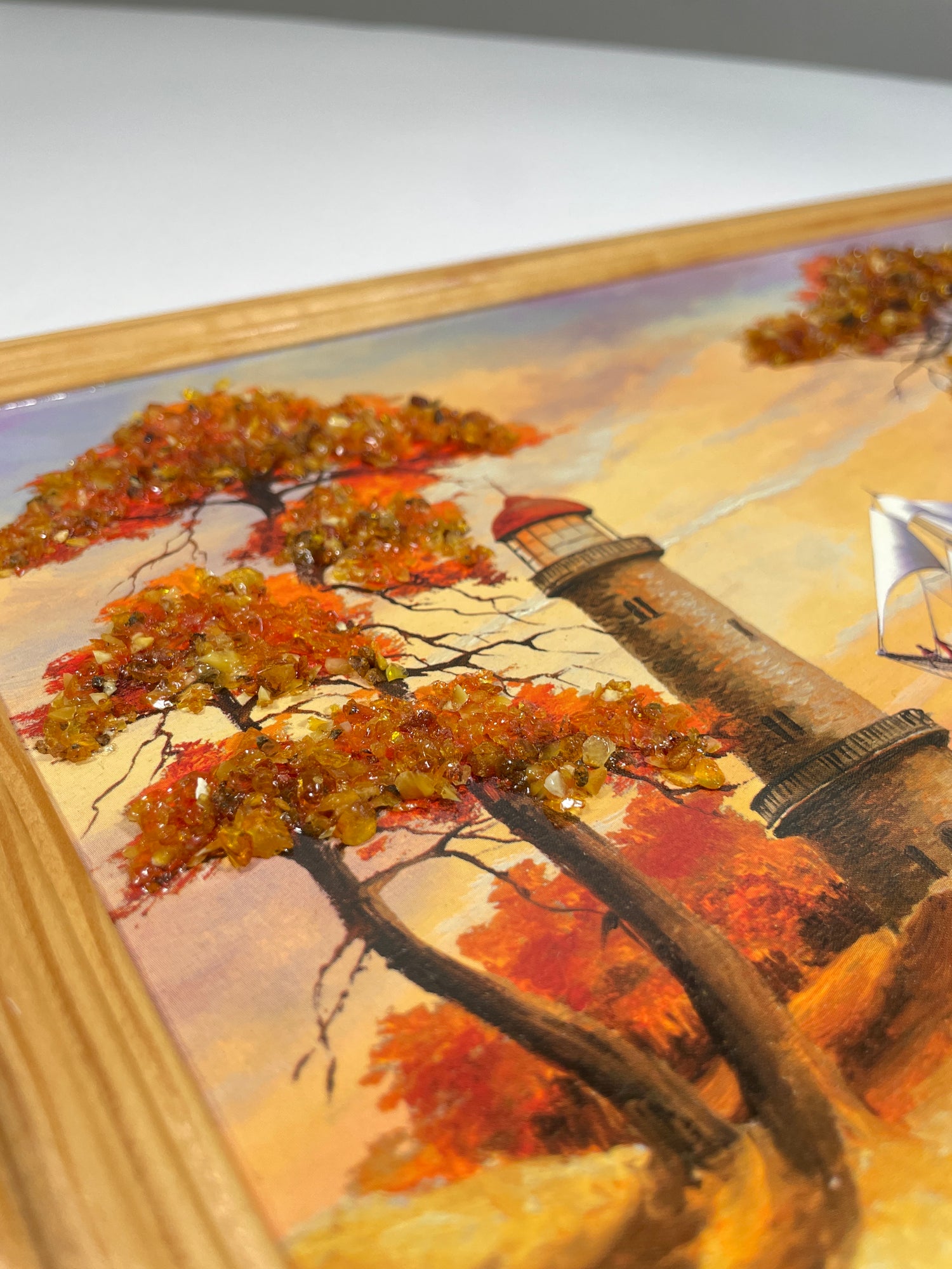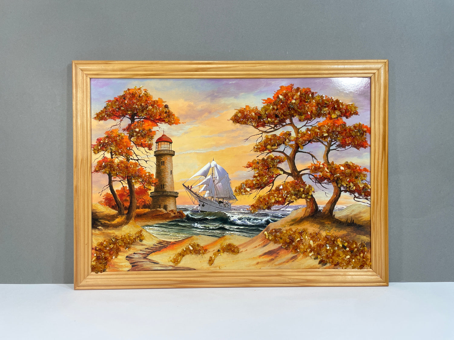 Maritimes Wandbild – Schiff, Küste, Bäume, Leuchtturm, verziert mit Bernstein