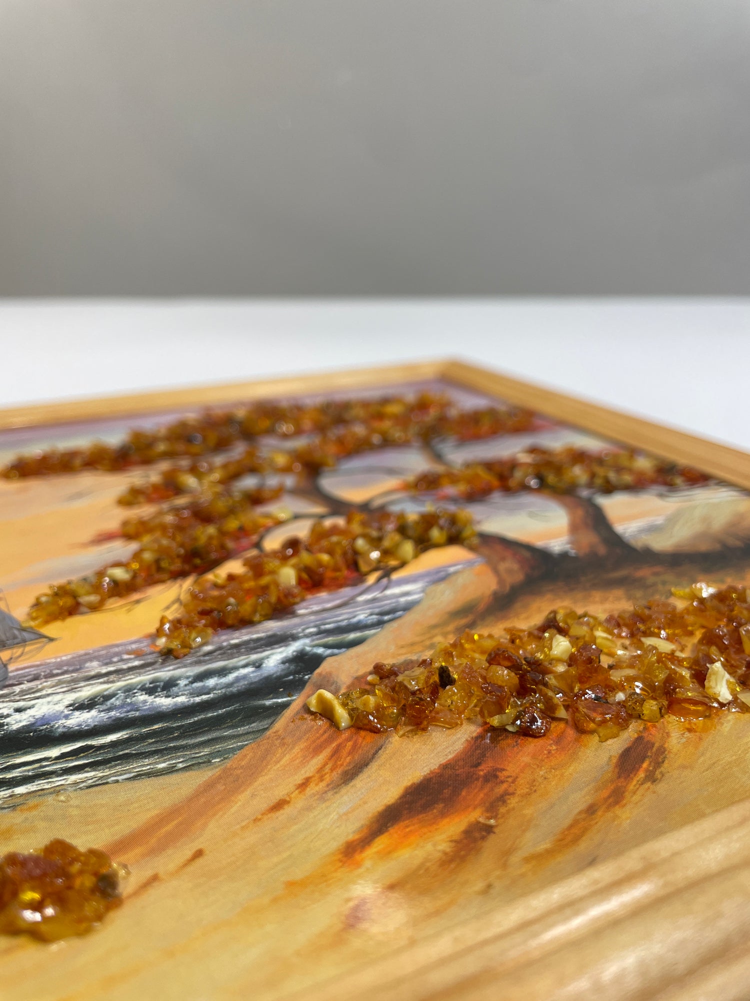 Das Druckbild zeigt ein Schiff auf dem Meer, einen Leuchtturm, eine Küste und mehrere Bäume. Auch der Dünensand ist mit Bernstein verziert, der dem gesamten Motiv warme, goldbraune Akzente verleiht. Das Bild ist in einen Holzrahmen gefasst.