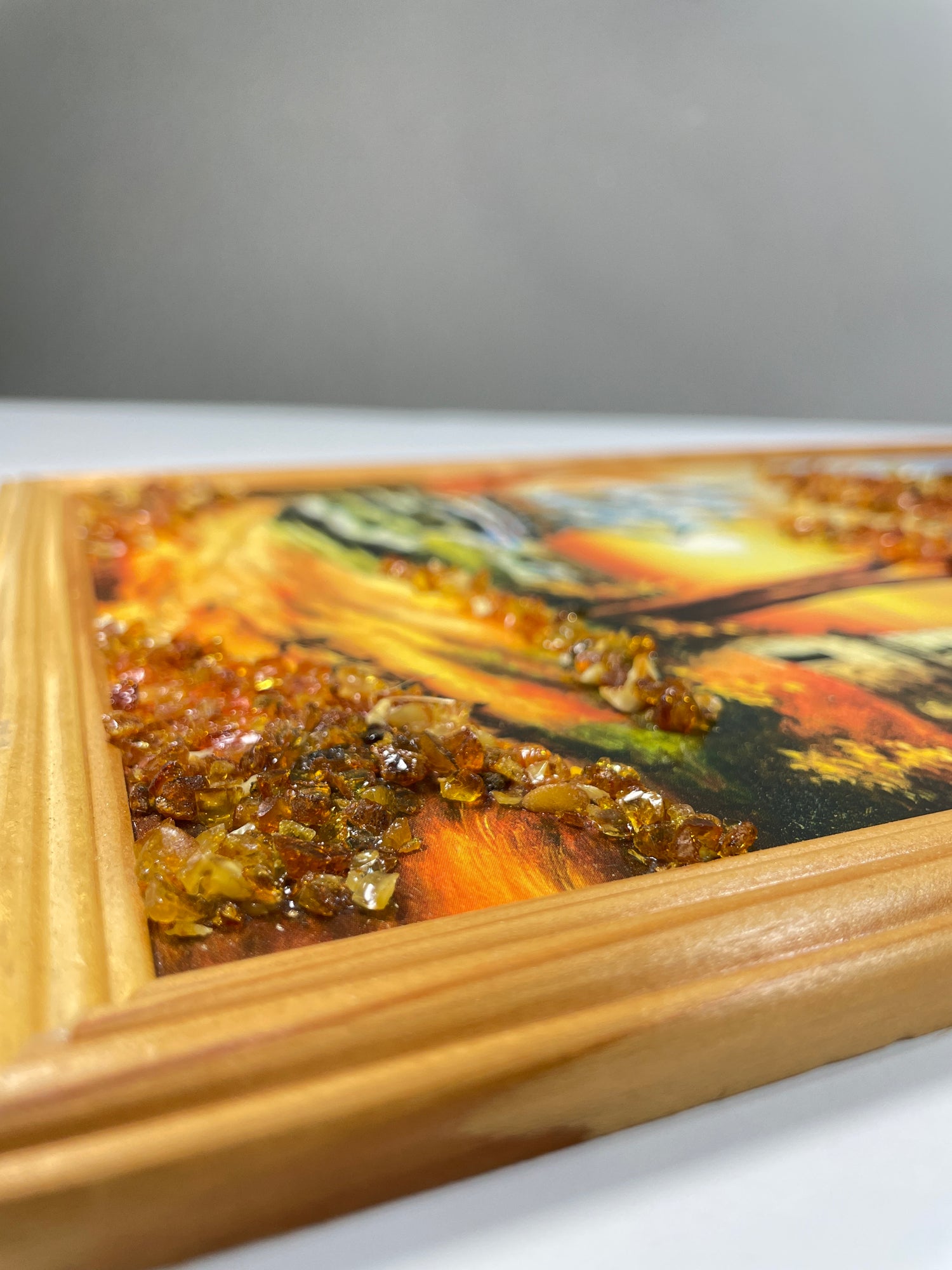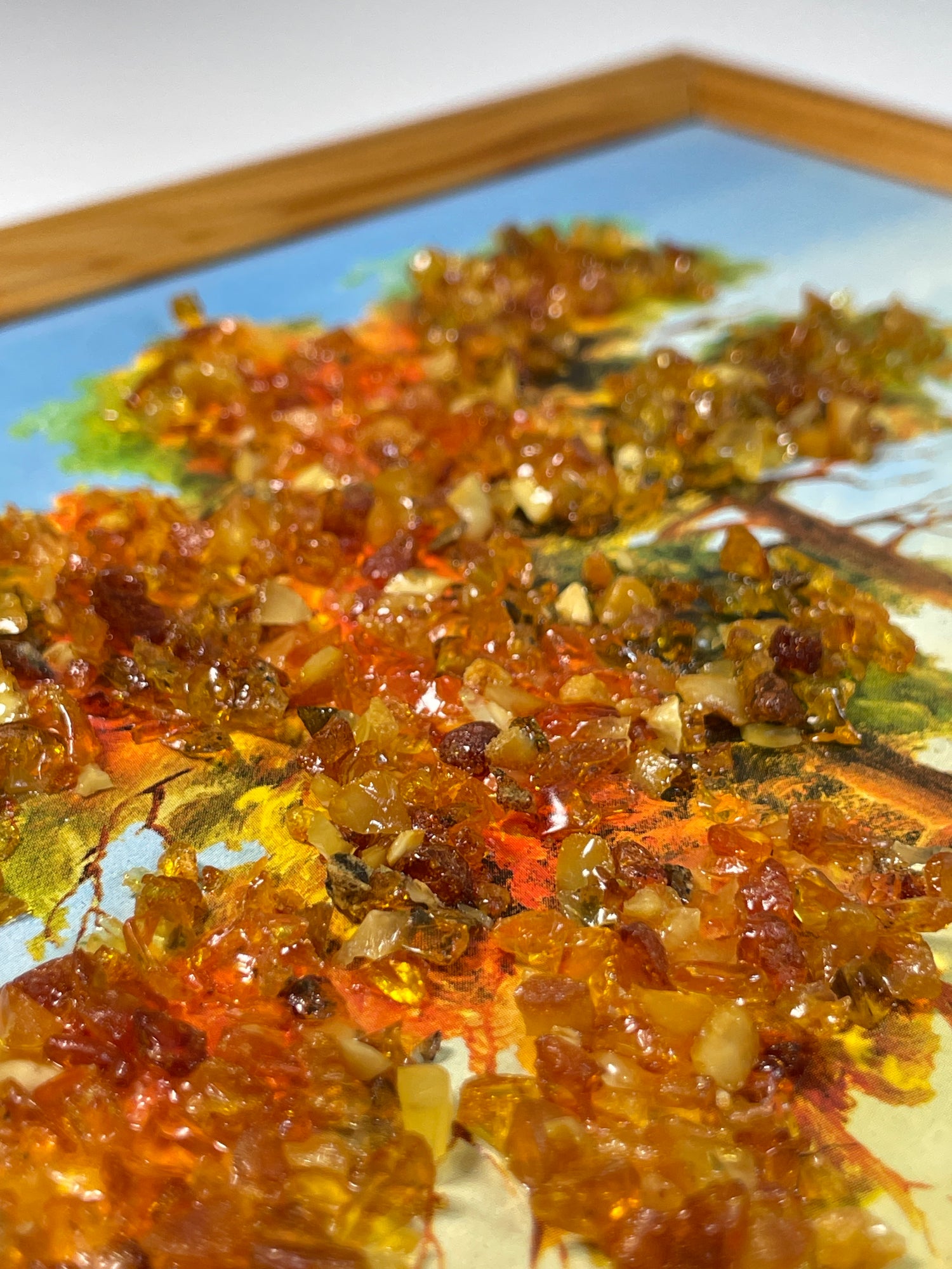 Dieses Wandbild zeigt das Meer mit Wellen, ein Schiff, einen Baum und einen Leuchtturm. Mit echtem Bernstein verziert und in einem Holzrahmen eingefasst.