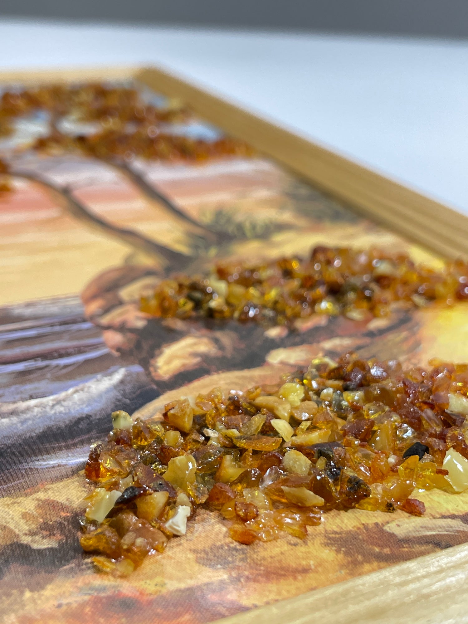 Das Druckbild zeigt ein Schiff auf dem Meer, eine Küste und einen Baum. Bernsteinverzierungen wirken wie warmes, goldbraunes Herbstlaub und setzen natürliche Akzente im gesamten Motiv. Das Bild ist in einem Holzrahmen eingefasst.
