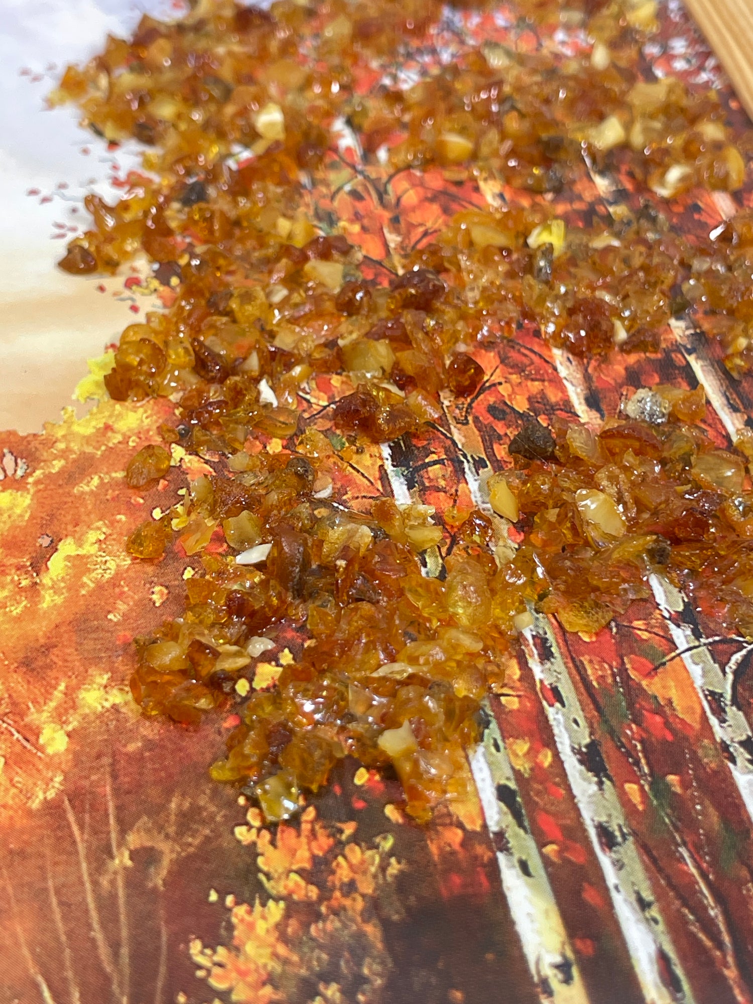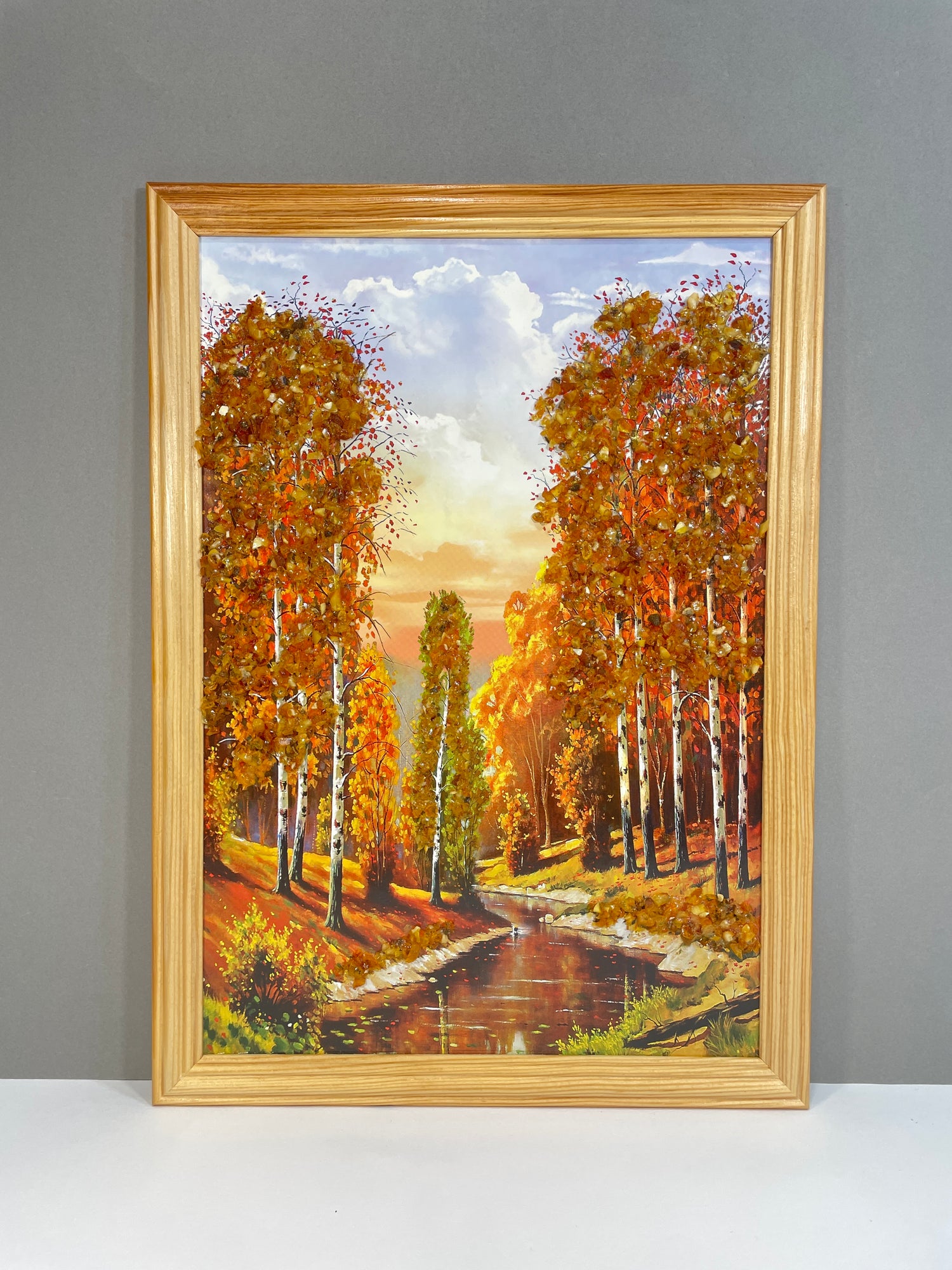 Birkenwald am Fluss | Druckbild, verziert mit Bernstein | Holzrahmen
