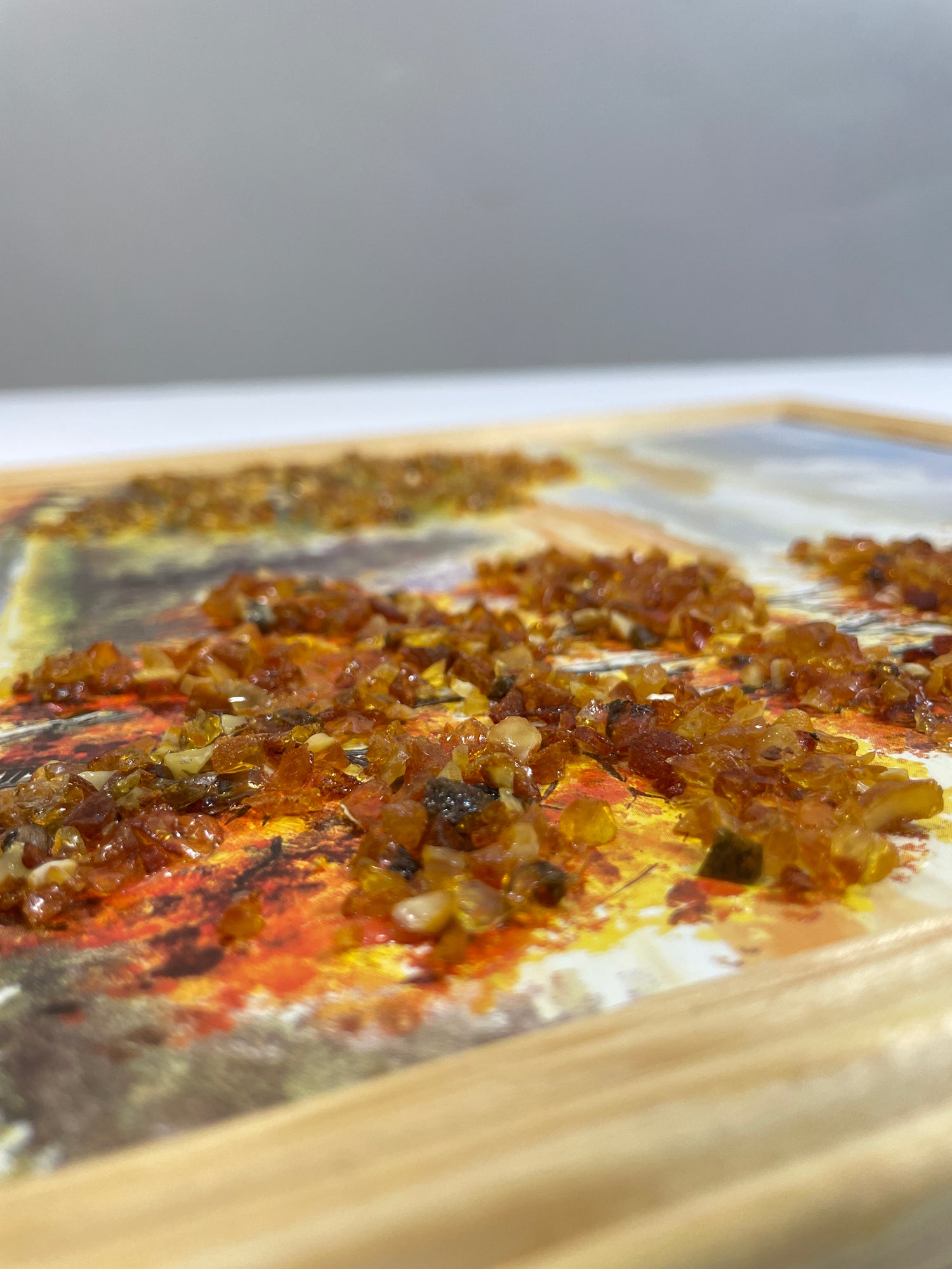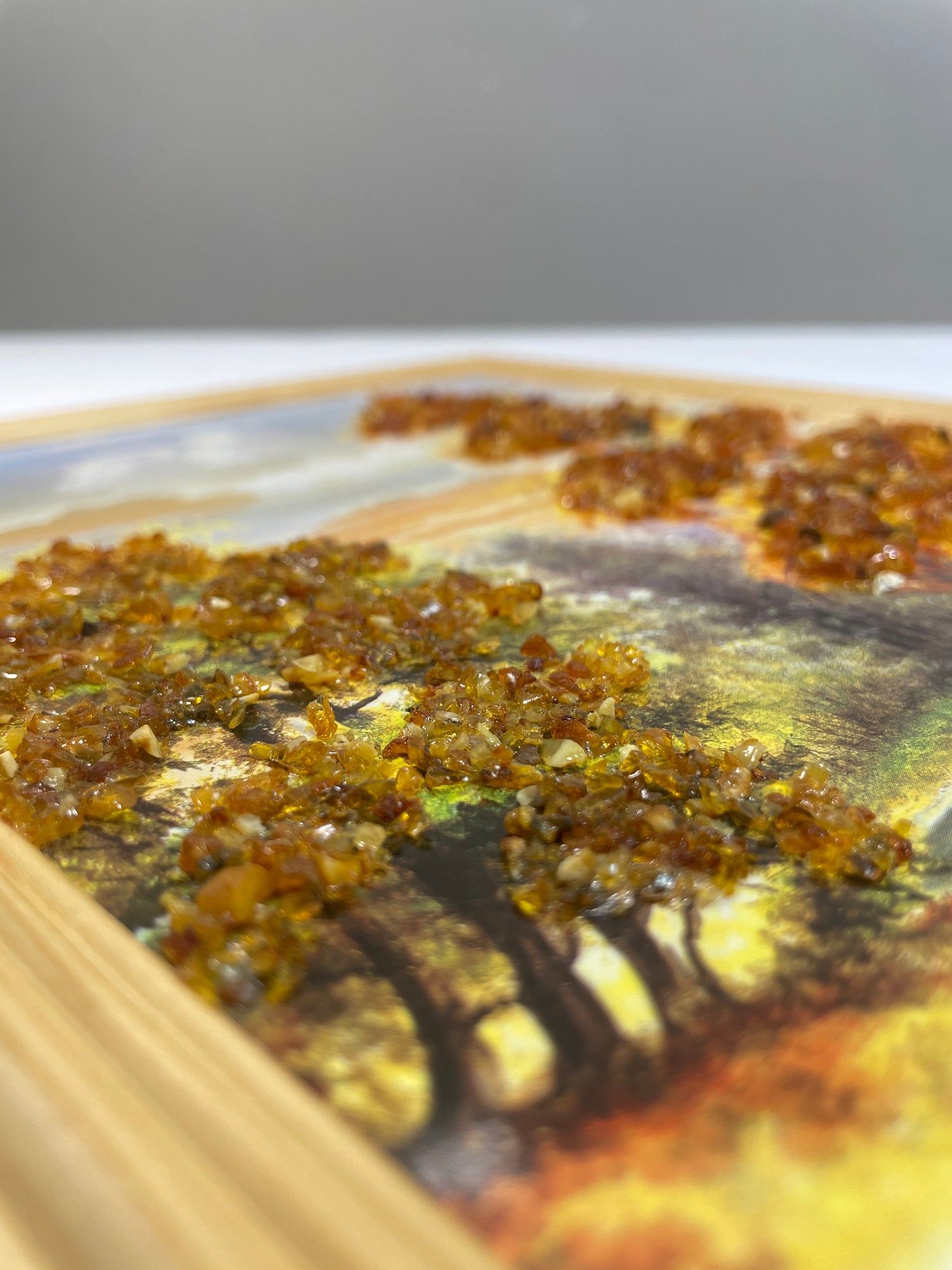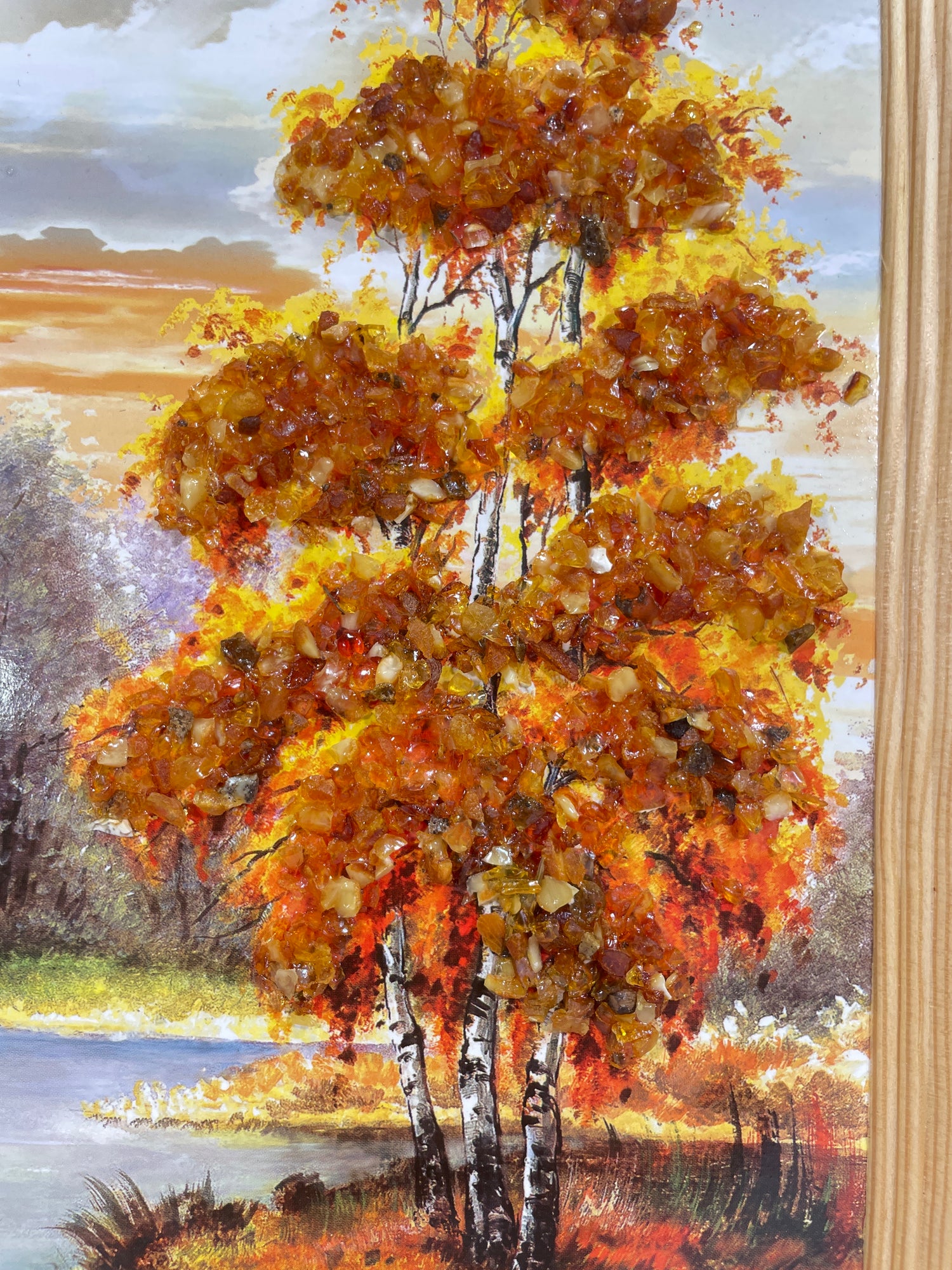 Druckbild einer Landschaft mit Birken, weiteren Bäumen und zwei Booten im Wasser. Bernsteinakzente setzen warme Highlights. In Holzrahmen eingefasst – Wanddekoration trotz kleiner Mängel ein schönes Bild.